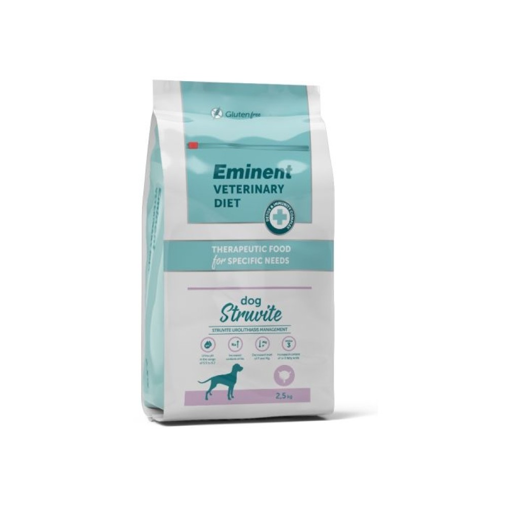 Η επιλογή του σωστού φαγητού είναι ένα πολύ σημαντικό μέρος της θεραπείας ασθενών με ουρόλιθους στρουβίτη. Η κατάλληλη τροφή βοηθά στην επαναφορά του pH των ούρων στο βέλτιστο εύρος και συμβάλλει στη διάλυση των υφιστάμενων λίθων από στρουβίτη. Λόγω του μειωμένου επιπέδου των μετάλλων, υπάρχει ελάχιστη πιθανότητα σχηματισμού νέων κρυστάλλων. Αυτές οι ειδικές απαιτήσεις πληρούνται από την πλήρη τροφή EMINENT VETERINARY