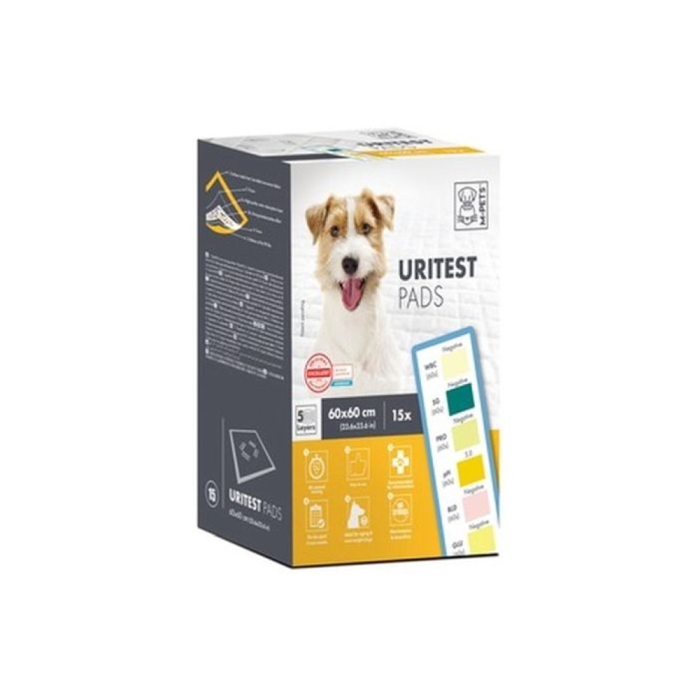 Οι πάνες URITEST προορίζονται να παρέχουν μια γρήγορη διάγνωση διαταραχών και ασθενειών του ουροποιητικού συστήματος. Παρέχει πληροφορίες σχετικά με τη συγκέντρωση αίματος (WBC & BLD), ειδικό βάρος ούρων (SG), πρωτεΐνη (PRO), τιμή pH (pH) και γλυκόζη (GLU) στα ούρα του κατοικίδιου ζώου σας. Διάρκεια εξέτασης 60 δευτερόλεπτα. Εύκολο στη χρήση. ’μεση λήψη 6 αποτελεσμάτων Ιδανικό για σκύλους μεγάλης ηλικίας ή υπέρβαρους. Μη επεμβατικό και χωρίς άγχος. Επιφάνεια κατασκευασμένη απο μη υφασμένο ύφασμα με θερμή έλαση. Στρώμα απορρόφησης νερού υψηλής ποιότητας. Ισχυρή επίδραση απόσμησης. Κάτω μέρος της μεμράνης πολυαιθυλένιου. Αδιάβροχη. Γρήγορη στο στέγνωμα, χωρίς οσμές, καθαρές πατούσες, προσελκυστικό. Δερματολογικά ελεγμένο.