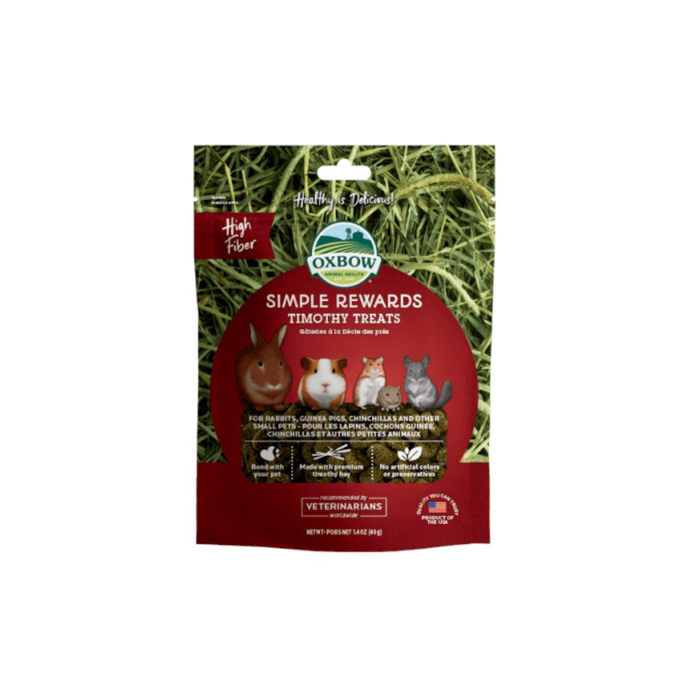 Το Oxbow Timothy Treats είναι μια υγιεινή λιχουδιά για κουνέλια, ινδικά χοιρίδια, τσιντσιλά και άλλα μικρά τρωκτικά. Φτιαγμένο με πλούσιο σε φυτικές ίνες χόρτο Timothy, το Timothy Treats, προσφέρει ελκυστική γεύση και άρωμα. Χρησιμοποιήστε το, για να προσθέσετε ποικιλία και εμπλουτισμό στη διατροφή του κατοικίδιου ζώου σας. Σαν επιβράβευση, Το Timothy Treats σάς επιτρέπει να δώσετε στο κατοικίδιό σας μια υγιή, νόστιμη λιχουδιά, για την οποία μπορείτε να είστε και οι δύο χαρούμενοι. Φτιαγμένο με 100% Timothy hay. Χωρίς τεχνητά χρώματα ή πρόσθετη ζάχαρη. Βοηθά στην υποστήριξη των δεσμών ιδιοκτητών κατοικίδιων ζώων.