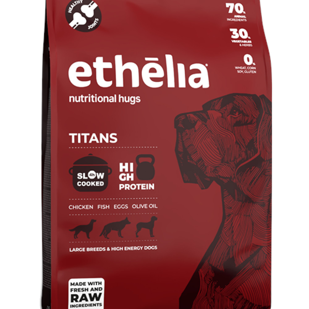 Χωρίς καλαμπόκι, σόγια, κρεατάλευρα ή χημικά συντηρητικά, η Ethelia Titans είναι «καθαρή», ήπια επεξεργασμένη ξηρά τροφή από φρέσκα υλικά.