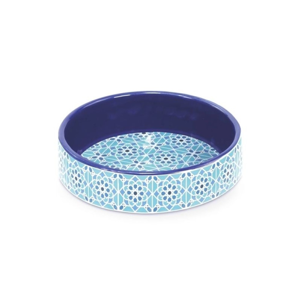 Μπολ γάτας Mirage, με γεωμετρικό σχέδιο μπλε και γαλάζιων αποχρώσεων, φτιαγμένο από μελαμίνη. Ενα προιόν απόλυτα ασφαλές στην επαφή με το φαγητό και το νερό καθώ δεν περιέχει ρητίνη και επικύνδυνες χρωστικές. Είναι εξοπλισμένο με πλαστικά επιθέματα στην βάση, για να μην γλιστράει από απότομες κινήσεις και για καλύτερη ισορροπία. Κατάλληλο για το πλυτήριο πιάτων