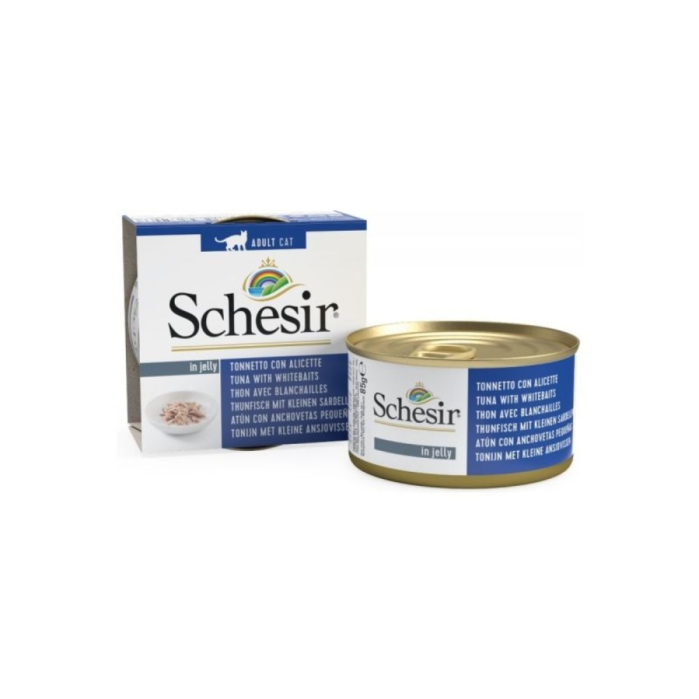 SCHESIR Γευστικά γεύματα με τόνο και αθερίνα σε ζελέ για ενήλικες γάτες.